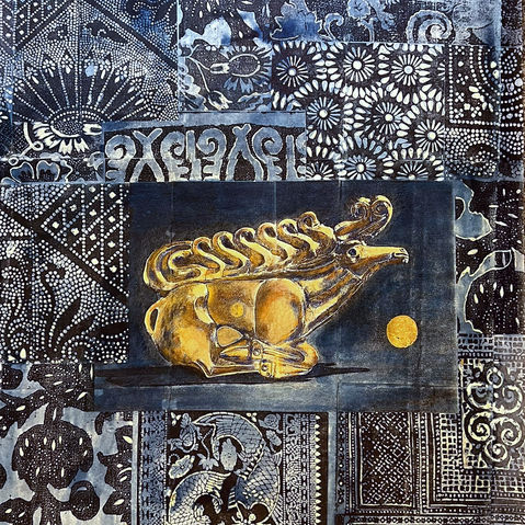 Indigo fabric designs create a backdrop for small pockets of wildlife.